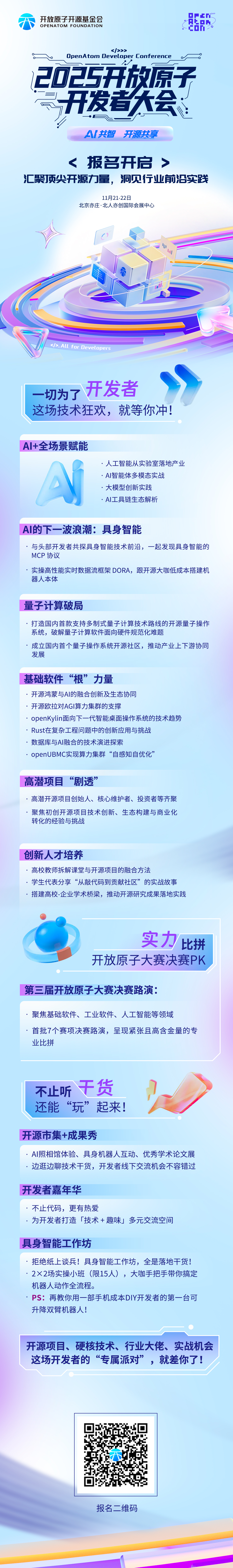 无论你是深耕某一技术栈的资深工程师,还是对开源充满好奇的技术新人;无论你是高校中渴望通过真实项目提升自我的学生,还是正带领团队探索商业化路径的初创项目负责人,2025开放原子开发者大会都是你不可错过的“年度加油站”。在这里,你不仅能听到技术大咖的干货分享,还能: