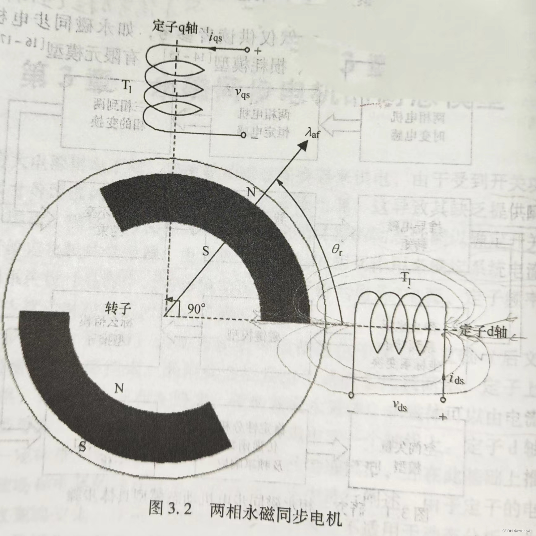 在静止的定子dq坐标系中,当转子的磁极轴线与定子的d轴重合时,永磁体磁极正对d轴线圈(定子的dq轴线圈是通过Clark变换等效的),如下图所示(夹角为45°电角度的情况):
