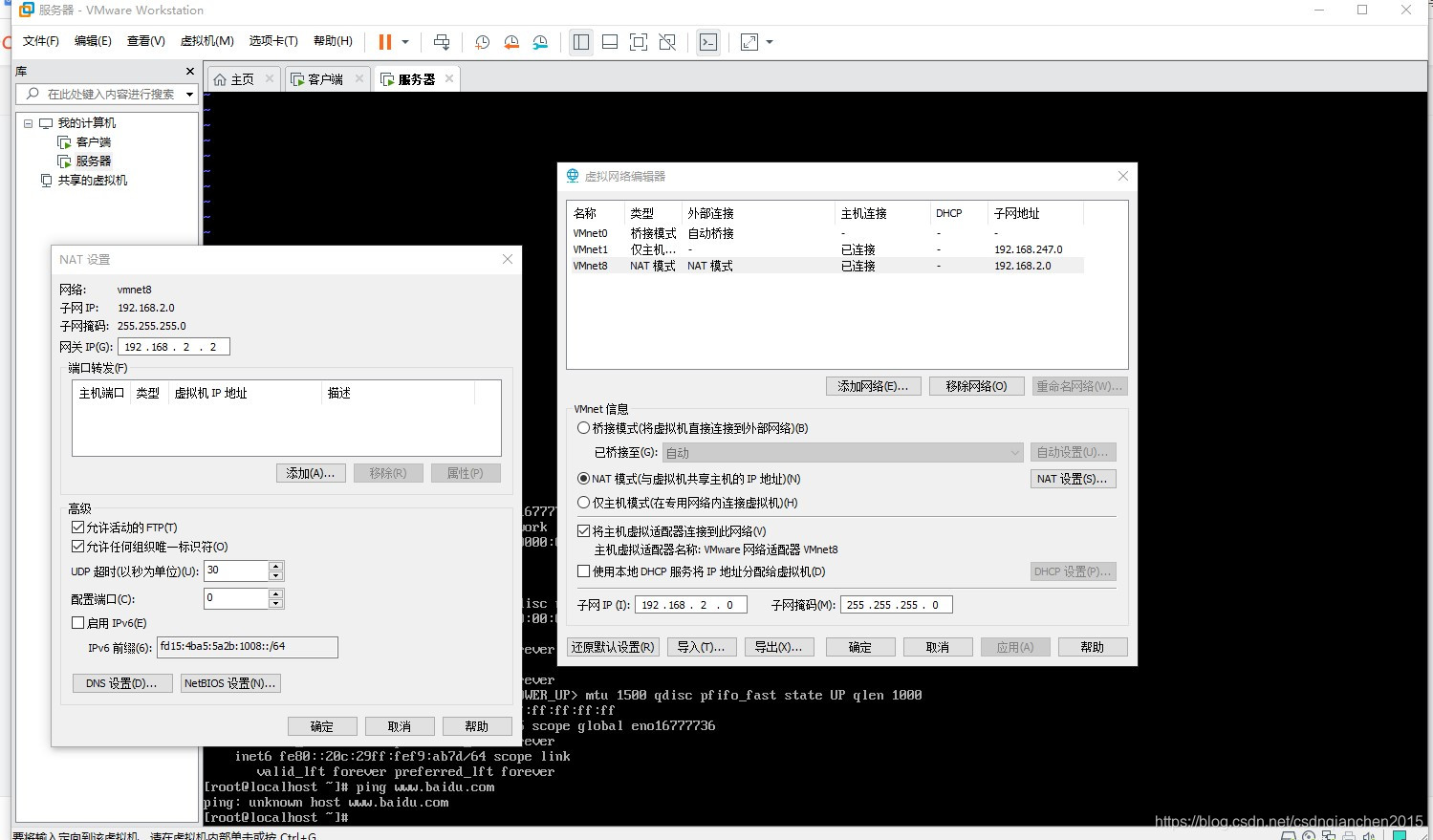 2.将要访问外网的虚拟机设置为net模式,查看net的网关地址,将虚拟机网卡的网关地址修改为与其一致。重启网卡,ping网关测试是否成功(在编辑里的虚拟网络编辑器)