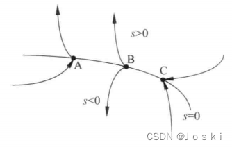 首先考虑定义中的控制律可以使系统沿规定的状态轨迹做小幅度运动,这句话藏了两层意思:如何使系统沿设计的状态运动?以及沿什么样的状态运动?这就将其拆分为了两个问题。考虑一个超曲面s,它将状态空间切割为两部分:s>0和s<0。在切换面s=0上的运动点有三种情况: