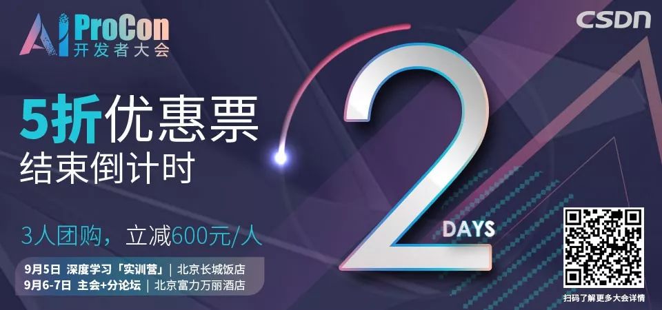 【温馨提醒】2019 AI ProCon 5 折特惠票倒计时 2 天,另有团购通道,更多信息马上点击阅读原文。