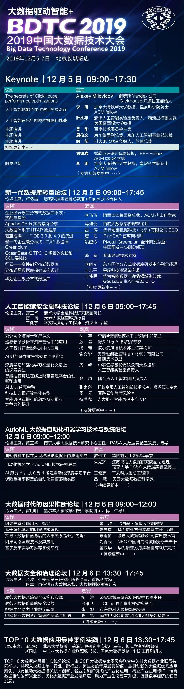 2019年12月5-7日,由中国计算机学会主办,CCF 大数据专家委员会承办,优快云、中科天玑数据科技股份有限公司协办的中国大数据技术大会(BDTC 2019)将于北京长城饭店隆重举行。届时,超过百位顶尖技术专家将齐聚于此,聚焦智能时代大数据技术的发展曲线以及大数据与社会各行业相结合的最新实践进展,紧贴时代脉搏,走近数据与智慧前沿。在过去十二年里,这场盛会从最初仅 60 余人参加的技术沙龙到如今数千人的技术盛宴,俨然已成为国内规模空前、水平领先和影响力非凡的大数据技术盛会,最近每年都会召集上百位国内外知名专家学者,吸引上千位开发者、高校师生及各行业的科技发烧友。 因悉来路,故知何往——它就是BDTC 2019。 在会议质量上,2019 中国大数据技术大会汇集政产学研各方近 30 位专家学者组成大会主席团和大会程序委员会,在会议的主题策划、讲师邀约、议题审核等方面层层把关,不断优化议程结构,尽可能提升内容层面的参会体验,全力为与会者带来一场高水平的大数据技术盛会。 除主论坛外,主办方精心策划了13 场专题技术和行业论坛,包括新一代数据库转型、人工智能赋能金融科技、AutoML大数据自动化机器学习技术与系统、大数据时代的因果推断、大数据安全和治理、多模态知识图谱、大数据与AI中台、物流大数据、工业与制造业大数据、数据驱动与城市治理、智能驱动的大数据可视分析、IoT大数据技术、智能交通中的大数据技术等主题多样化组合选择的空间,让参会者制定专属自己的参会攻略。此外,大会还将邀请业内顶尖大数据应用的创建者和领航者,与观众分享最佳案例实践。更多重磅嘉宾和演讲议题持续更新中......◆特别福利◆目前距大会召开仅剩11天!为了让更多朋友不虚此行,从大会中真正受益,BDTC每年都会准备部分限量优惠门票,越早购票,优惠力度就越大。目前,大会6.6折特惠票限时抢购中(立减1400元),学生票仅售599元。 购票链接:https://t.csdnimg.cn/U1wA 欲知更多BDTC 2019精彩内容?扫描下图二维码或点击阅读原文,查看官网介绍。 联系我们:服务热线:15101014297媒体咨询:13301211220商务合作:18911709282大会邮箱:bdtc2019@126.com