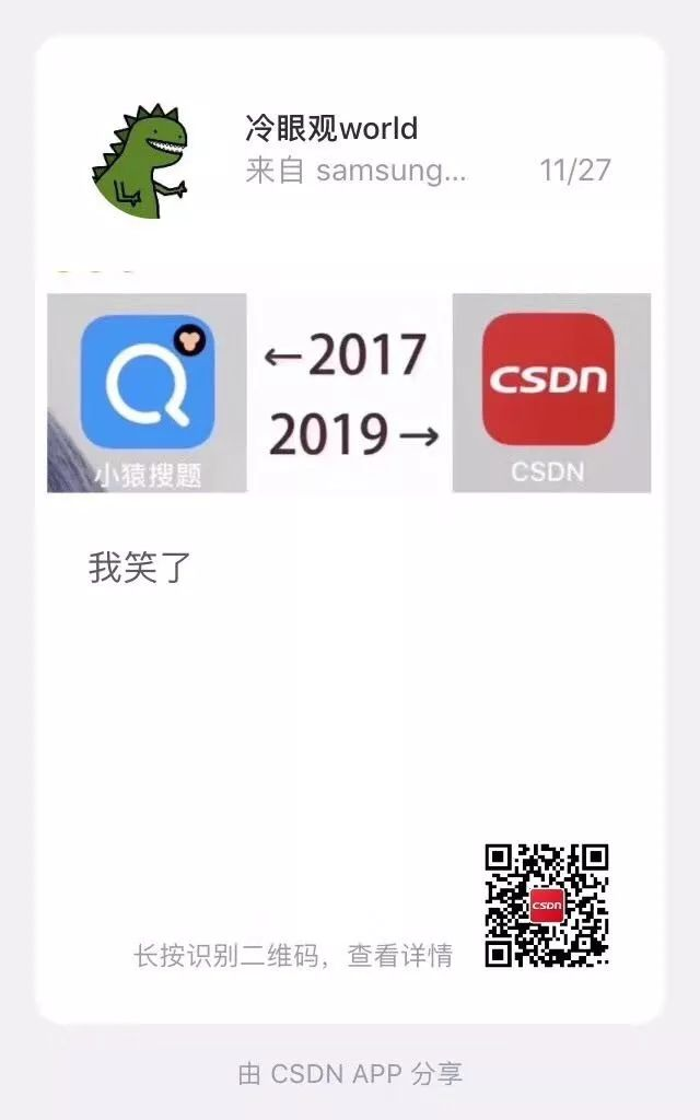 往 期 趣 闻 ☞20 年程序员变迁史…… | 每日趣闻 ☞过于真实!程序员的爱情观 | 每日趣闻 ☞假如程序员走方阵…… | 每日趣闻 ☞据说程序员看这 T-shirt 都会生气 | 每日趣闻 ☞大龄码农的肺腑之言,看完落泪 | 每日趣闻 点击阅读原文,精彩继续。 你点的每个“在看”,我都认真当成了喜欢