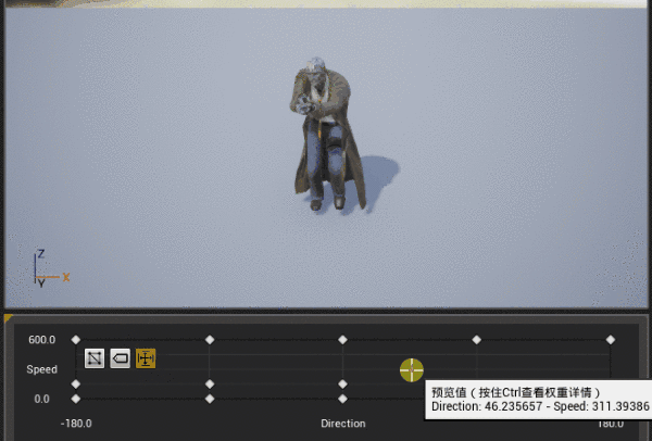 到目前为止,如果你认识到了移动表现=动画系统+移动系统,你已经基本理解了游戏角色的移动原理了。现在,不妨再稍微拓展一些。一般美术在制作动画时只会制作走路的动画以及奔跑的动画,他不会制作一个0.5/m的走路动画然后又制作一个0.6m/s的走路动画,如果每个速度都要做一个动画的话美术肯定要累死。那游戏中的玩家,在走路和奔跑切换时该怎么处理呢?答案就是把奔跑动画与行走动画进行融合,根据速度的不同,去混合这两种动画,我们可以称之为blend space,参考下面的图片。