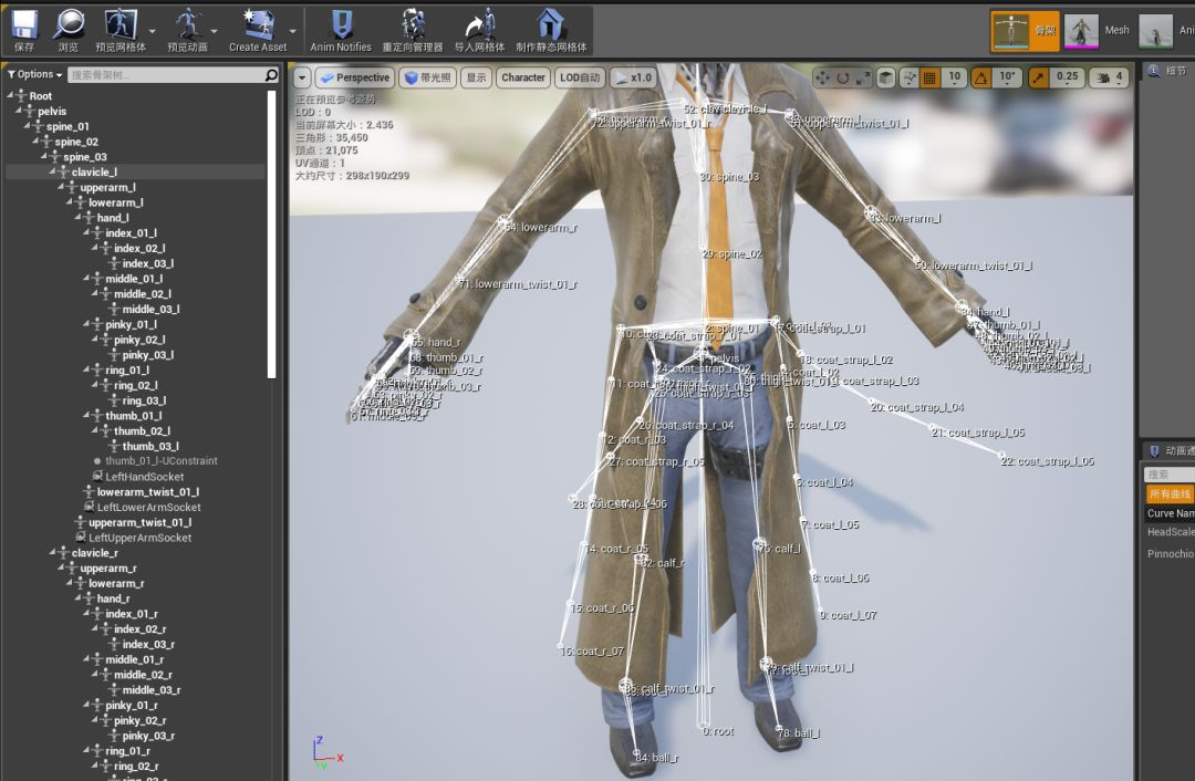 不过与2D动画将每一帧的画面记录下来不同,3D动画记录的角色的3D坐标数据。目前的3D动画实现方式都是由骨骼+蒙皮来做的,也就是说其实我们的每一个角色身上会有一些骨骼,当我们执行某个动画时对应的这些骨骼位置就会发生变化,然后再驱动这个骨骼的“蒙皮”(可以认为我们玩家的皮肤)变化。比如说,一个玩家把手举起来的时候,我们手臂对应的骨骼就会动起来然后包裹着他外面的皮肤也会随之移动,这样你就能看到一个真正的动画了。那么为什么他执行动画的时候不会移动呢?因为所有的动画默认都是相对他自身变化的,相对游戏世界他就是原地静止的。(其实也可以做到相对世界发生变化,这个概念叫RootMotion,在后面的文章里面会进一步讲解)