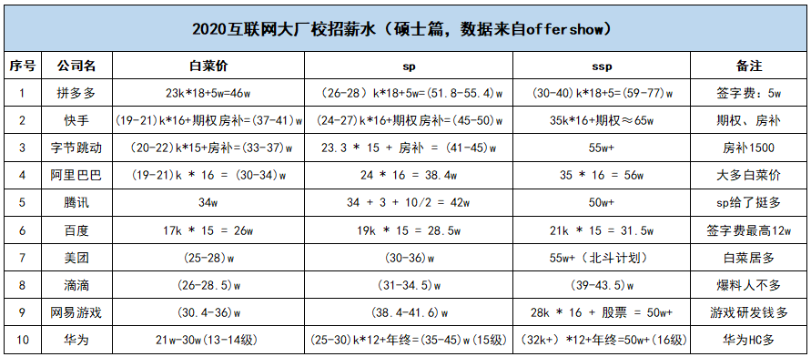 最近看网上有人爆料 2020 互联网大厂校招硕士生的薪资情况,这份榜单中包含了 10 家公司,其中有 4 家是我秋招中拿到 offer 且谈过薪资的。榜单中列出的薪资情况和我了解到的基本一致,而且我也问了身边很多同学以及抽查了一些 OfferShow 上的爆料,可以认定这份薪资还是比较真实可靠的!现在将分享给大家!需要说明的是这只是技术岗位的薪资,不包含非技术哦~
