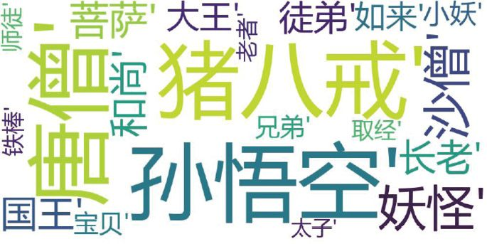 通过这个词云图,我们可以对于《西游记》中的重要人物一目了然,整个小说就是围绕着唐僧师徒四人展开的,他们的核心任务就是“取经”,他们会在取经路上遇到各种“妖怪”以及“小妖”,还好他们有重要的后援“菩萨”和“如来”。