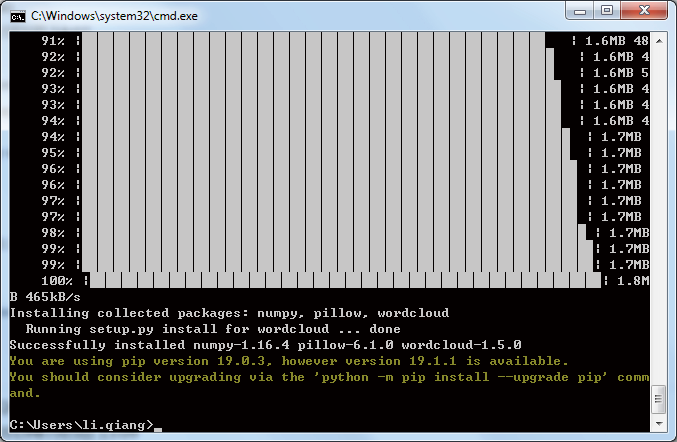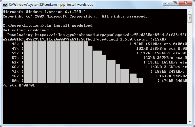 首先,我们需要安装 wordcloud 模块。还是使用 pip 工具,在命令行中输入“pip install wordcloud”,回车后开始安装。