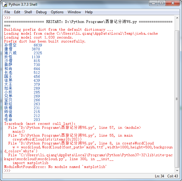 因为 wordcloud 模块要用到 matplotlib 模块,如果没有安装过这个模块,调用 wordcloud 就会报错。