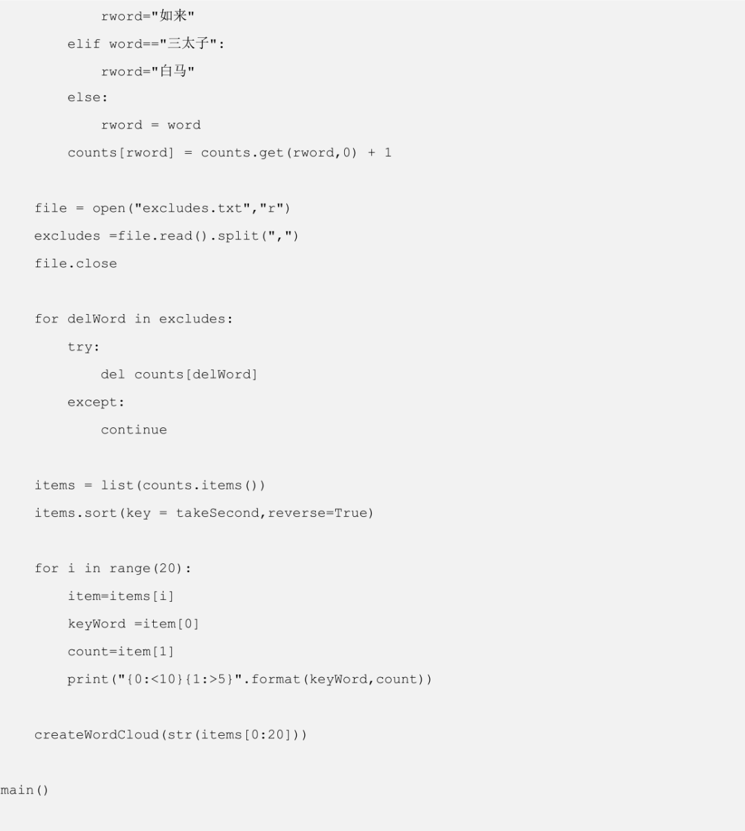 在 main()函数中,调用了这个新增加的函数,并且将列表 items 中的前 20 个高频词转换为字符串,作为参数传递给这个函数。