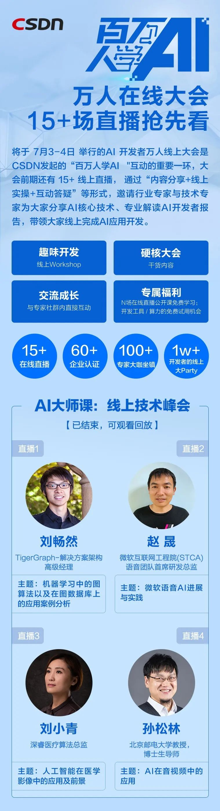优快云主办的AIProCon2020大会将于7月3-4日线上举行,汇聚百位AI专家,设置20大论坛,覆盖AI入门至技术应用,展示百万人学AI成果,免费报名参会。