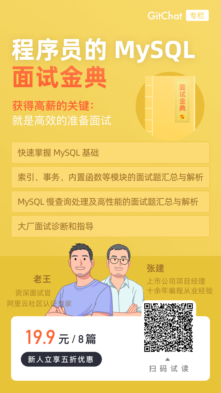 这次我从上千篇 GitChat 中找到 MySQL 相关的内容,涵盖 MySQL 面试必知必会、MySQL 性能优化、MySQL 技术实践系列。同样也有面向 MySQL 面试的专栏。以帮助大家更好的解决实践中的问题与突破大厂面试,拿高薪。