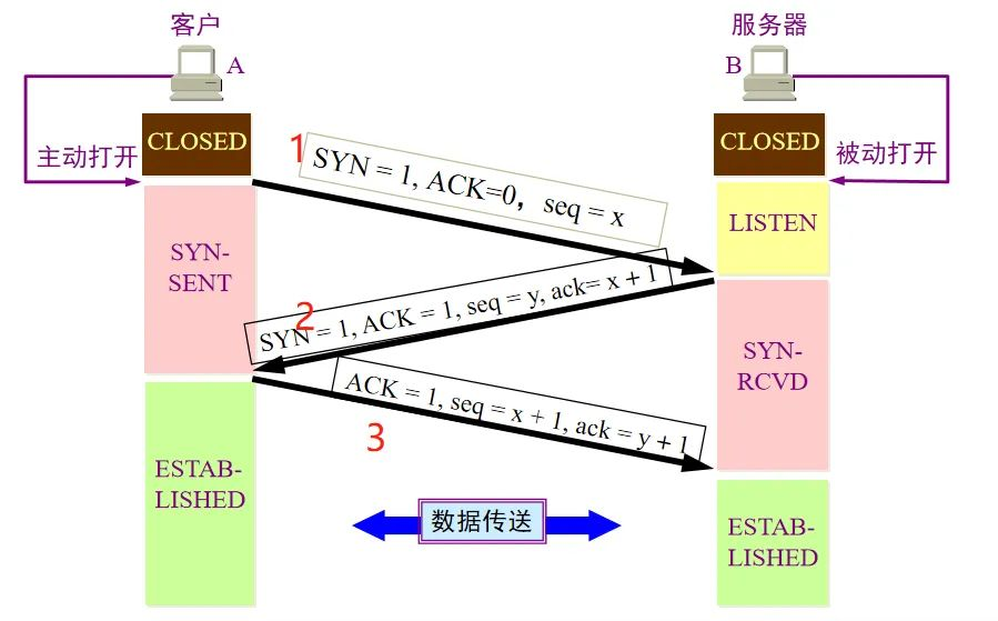传输连接有三个阶段,即:连接建立(三次握手)、数据传送和连接释放(四次挥手)。
