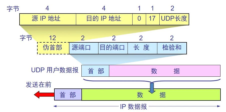 在计算检验和时,临时把“伪首部”和 UDP 用户数据报连接在一起。伪首部仅仅是为了计算检验和,伪首部12个字节取自IP数据报的字段;