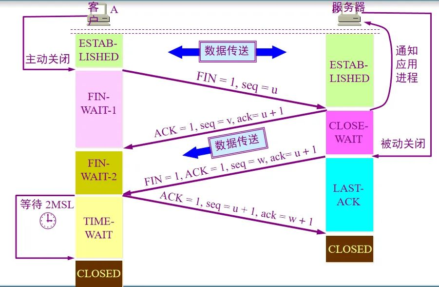 A 把连接释放报文段首部的 FIN = 1,其序号seq = u,等待 B 的确认(A:分手吧?)