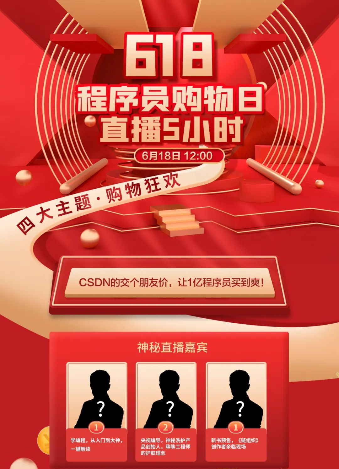 618不仅是消费者的购物狂欢,也是程序员们面对服务器压力的年中大考。在这一天,他们需要实时监控系统状态,调整计算资源,确保服务稳定。而优快云为感谢1亿粉丝的支持,在6月18日中午12点至18点,准备了红包雨、电子书体验卡、纪念版T恤等福利。