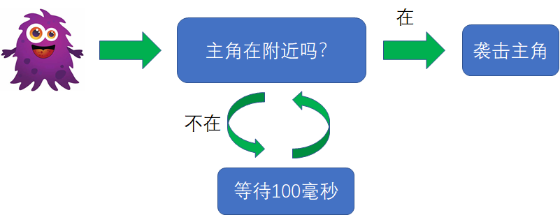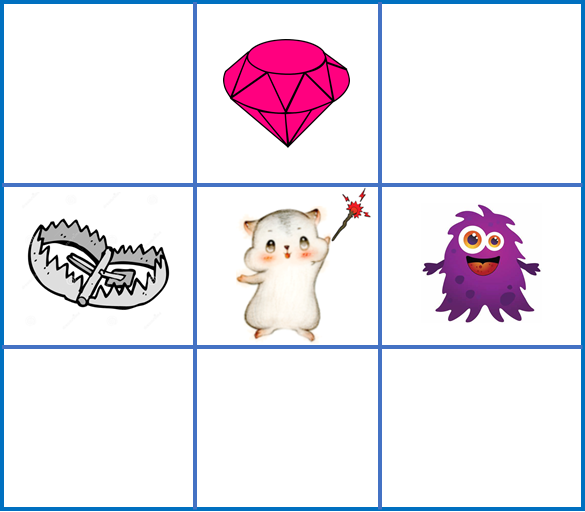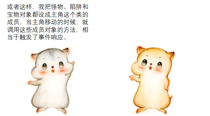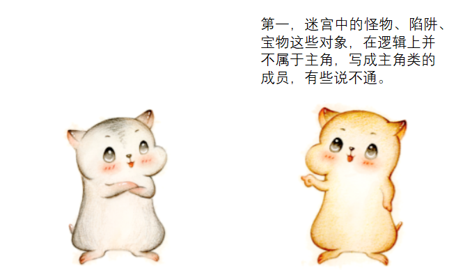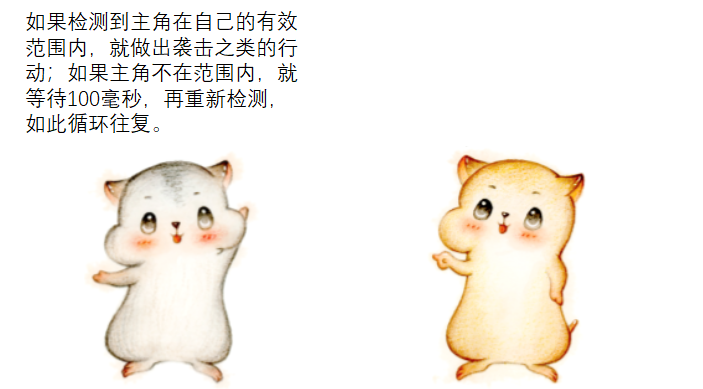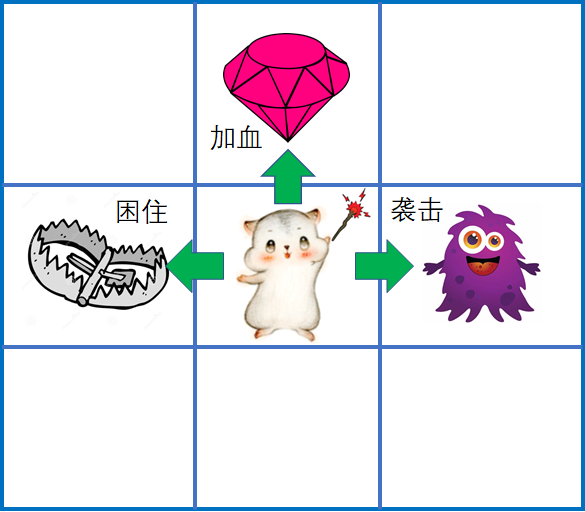 一旦主角移动到怪物的有效范围,怪物会袭击主角;主角移动到陷阱的有效范围,陷阱会困住主角;主角移动到宝物的有效范围,宝物会为主角加血。