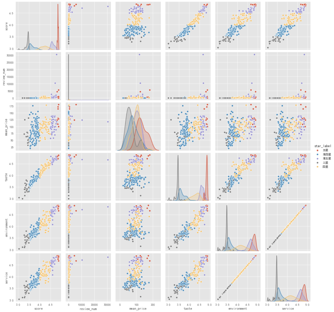 那么店铺得分与口味、环境、服务、评论数量、平均价格有关系吗?接下来我们绘制一张多变量图看一下。