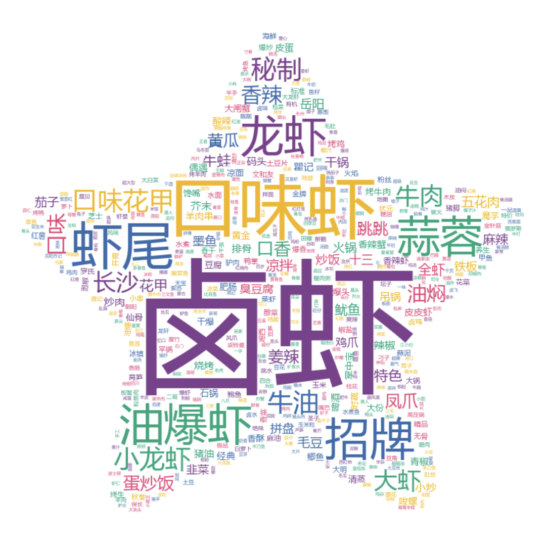 假设店铺的推荐菜就是不同店铺的热门菜,我们使用jieba对推荐菜进行分词并绘制词云图: