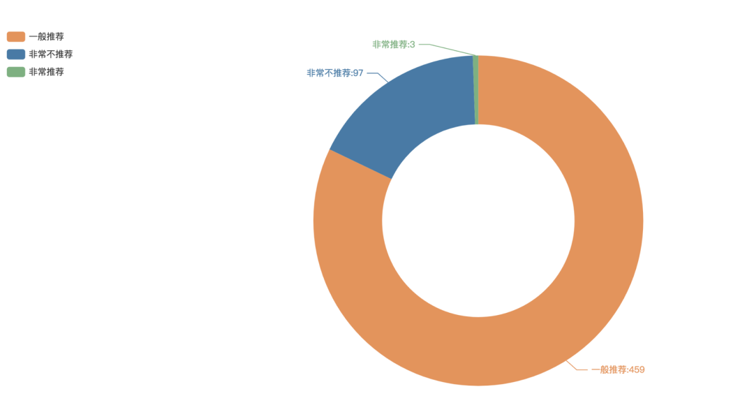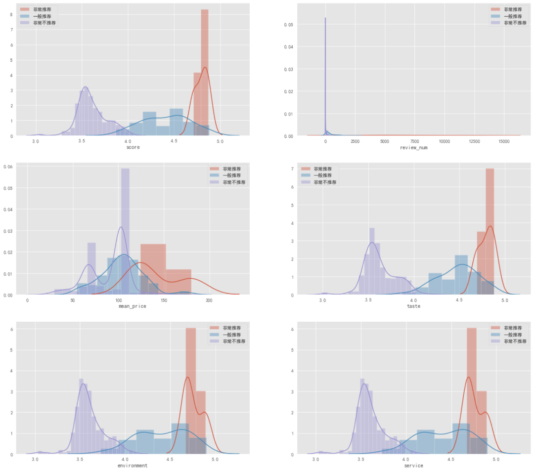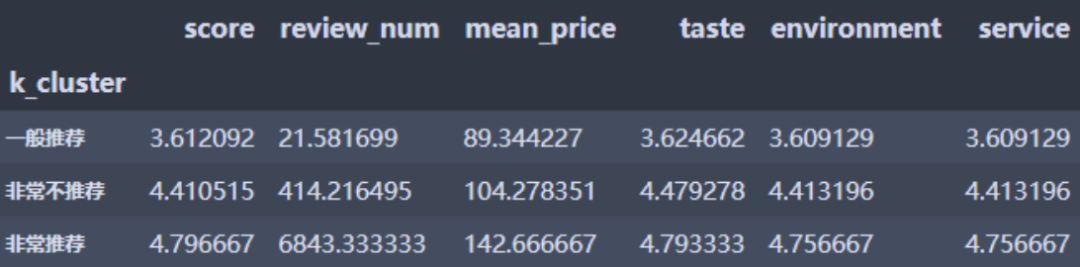 聚类分析用于将样本做群集划分,同一集群内成员的相似性要愈高愈好, 而不同集群间成员的相异性则要愈高愈好。我们使用Python进行了K-means聚类,对数值型变量:得分、评论数、平均价格、口味、环境、服务评论做群集划分,这里取K为3。得到以上三群,其中非常推荐的数量有3家,一般推荐的459家,非常不推荐的有97家。我们看一下这三群的描述性统计: