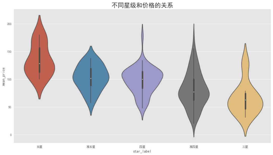 这里绘制了星级和价格分布的小提琴图,用来展示多组数据的分布状态以及概率密度。从图形可以看出,不同星级和价格之间的分布有显著差异,表现为星级越高,平均消费价格越高。