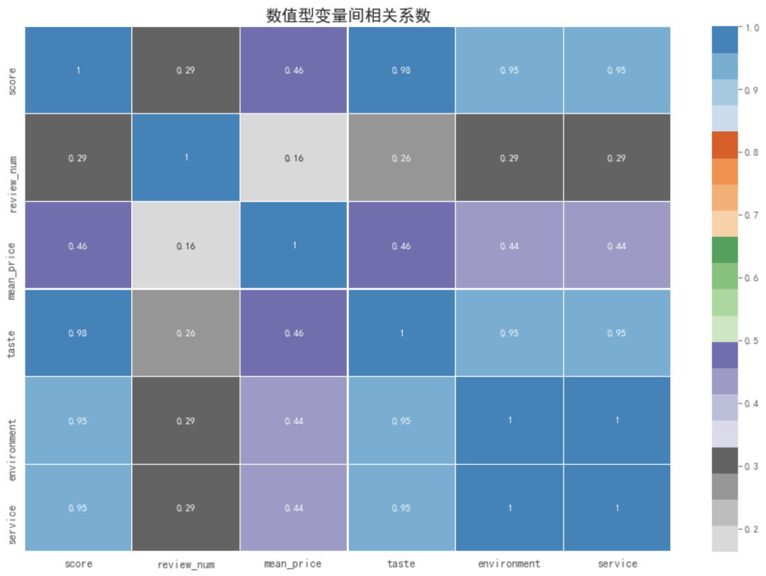 口味、环境、服务得分之间有显著的正相关,三者存在高则同高的情况。