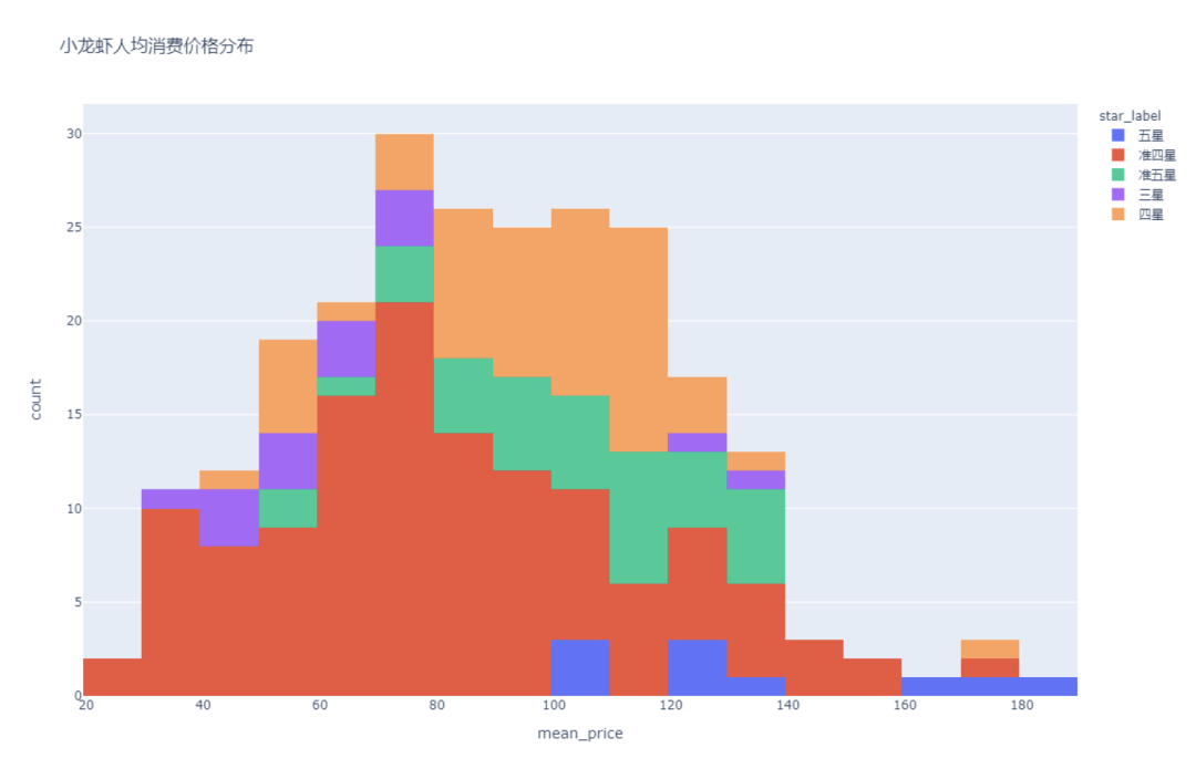 我们绘制了所有店铺口味虾人均消费价格分布的直方图,发现价格分布在20~180元之间,其中人均消费大部分都在67-111元的区间内。扩展看,人均消费和商户的星级有关系吗?