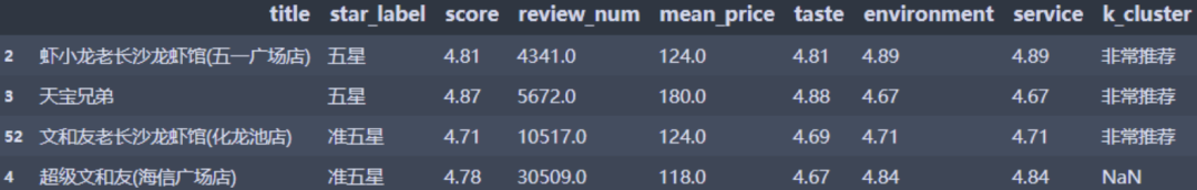 由于在做聚类分析时候去除了一个评论数为30509.0的异常样本。加上这条样本,得到最终推荐的四家店铺: