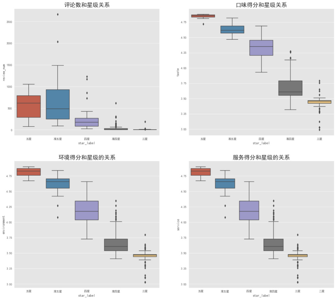 我们预想,星级评价越好,它在口味、环境和服务的得分越高,热度也就越高,从绘制出来的箱线图也可以验证我们的这一假设。