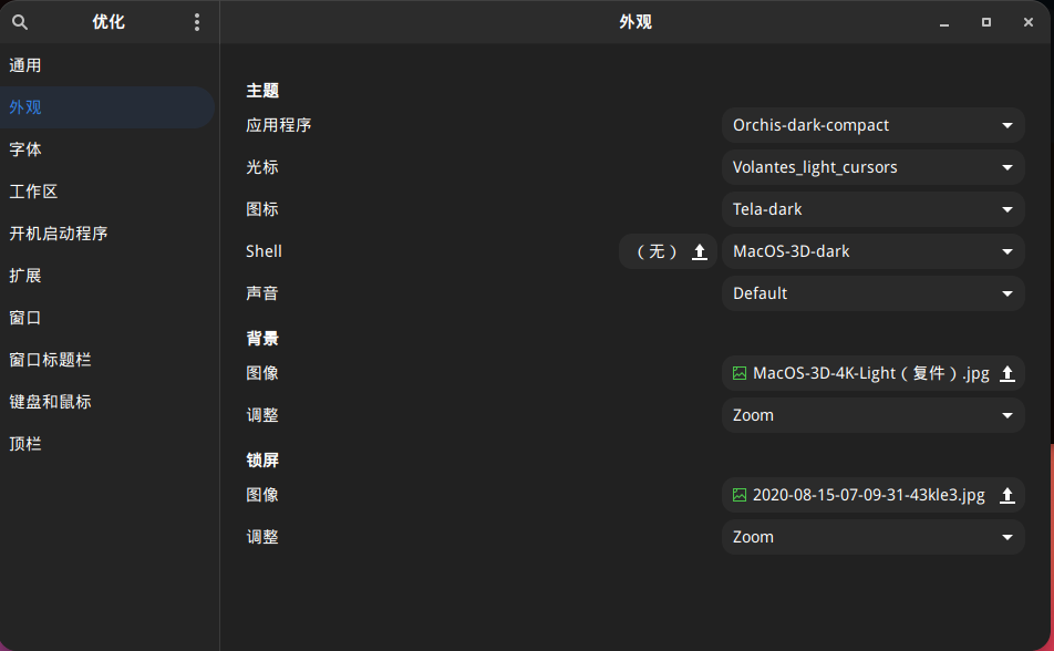 主题下载后解压,放到上面创建的主题目录,图标和光标放到图标对应的目录,然后启动gnome-tweak-tool 在外观中配置,我使用的是纯黑色主题