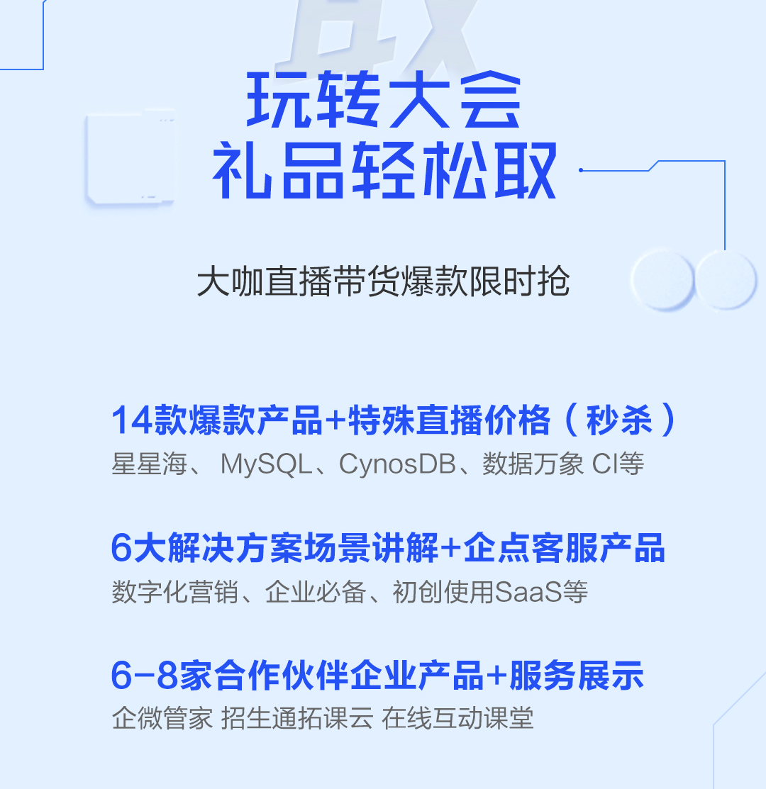 值得一提的是,腾讯全球生态数字大会上还准备了非常丰富的礼品,星星海、MySQL、CynosDB、数据万象 CI 等品牌产品超低直播价秒杀、在线互动课堂等你来 Pick!