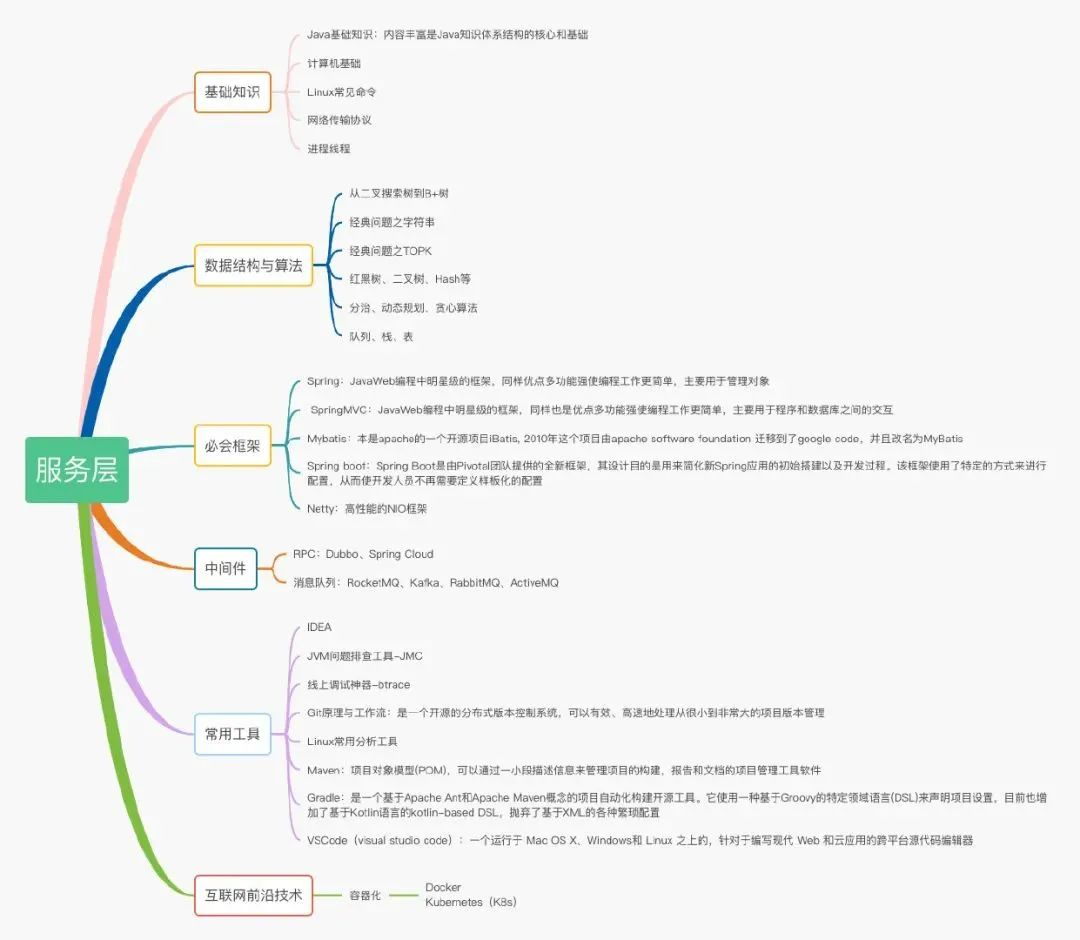 这一层有点东西了,算是整个框架的核心,如果你跟敖丙一样以后都是从事后端开发的话,我们基本上整个技术生涯,大部分时间都在跟这一层的技术栈打交道了,各种琳琅满目的中间件,计算机基础知识,Linux 操作,算法数据结构,架构框架,研发工具等等。