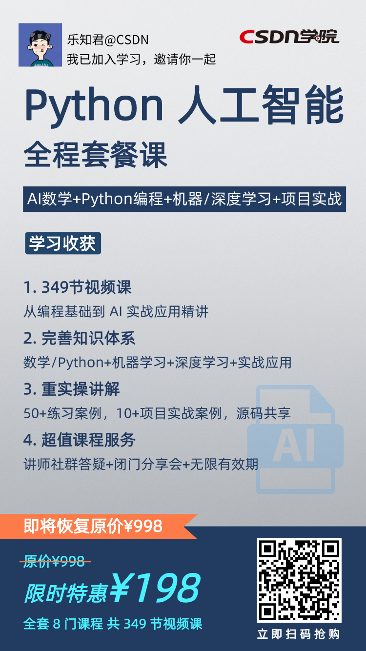 助你解决AI数学、Python编程、机器学习、深度学习、项目实战等难题,相当于花198元请了8位专业的私教!简单挑选一些,分享给大家: