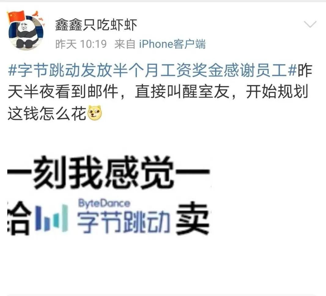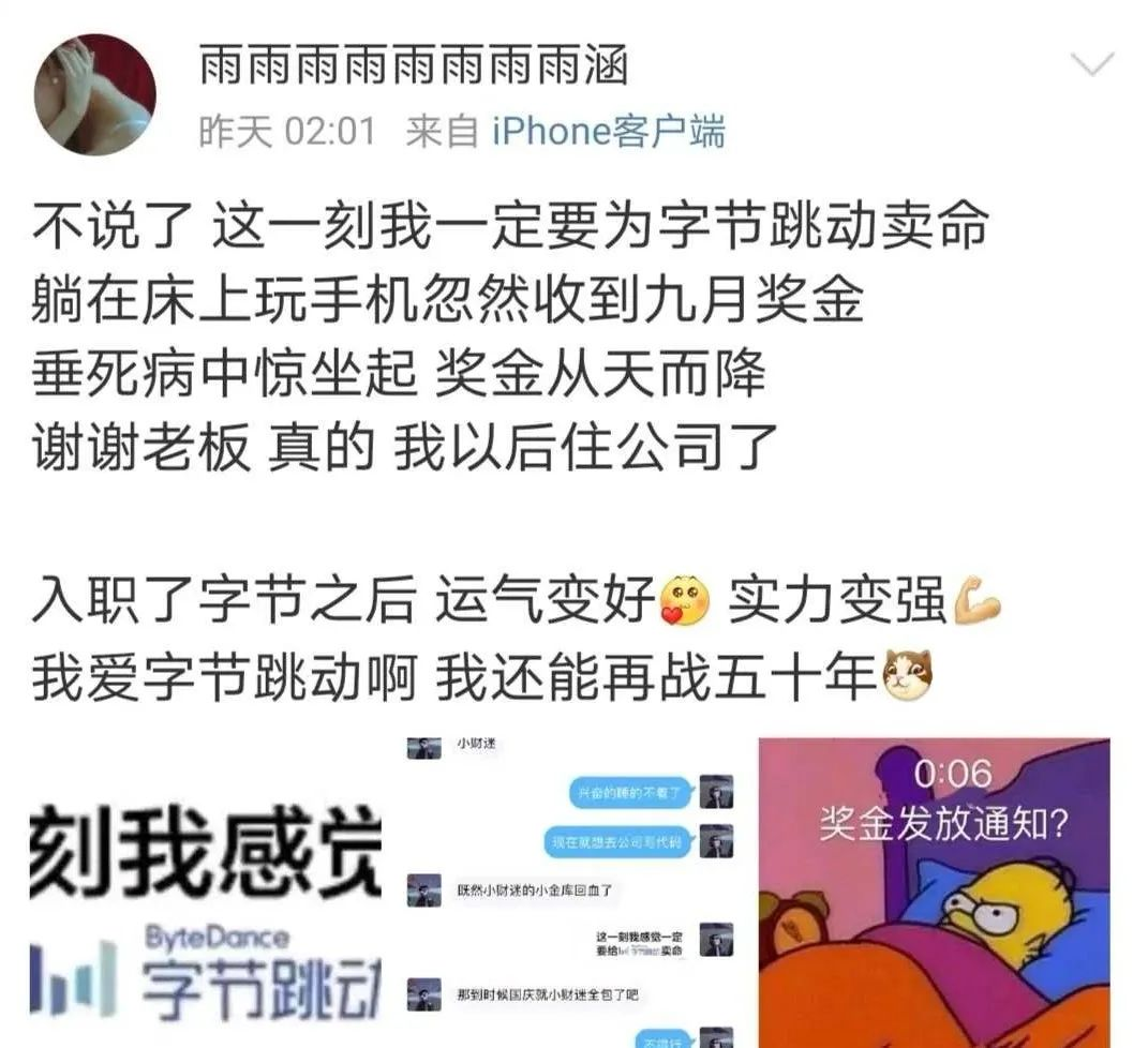面对这笔天降之财,不少字节跳动员工在微博、脉脉等网站发声,称已经收到公司发放的奖金,还有的员工打趣称,“我以后住公司了”,“扶我起来,我去上班了。”