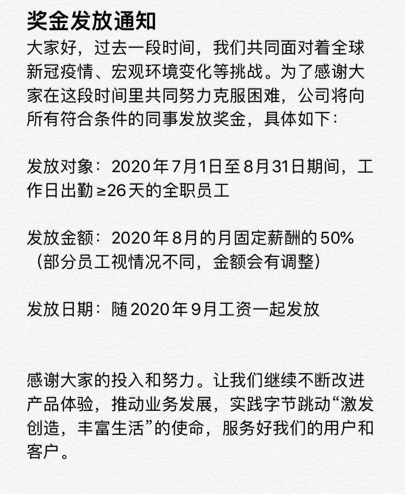 2020年9月,字节跳动为应对全球新冠疫情及宏观环境变化带来的挑战,向符合条件的全职员工发放相当于8月份固定薪酬50%的奖金,以此感谢员工的共同努力。
