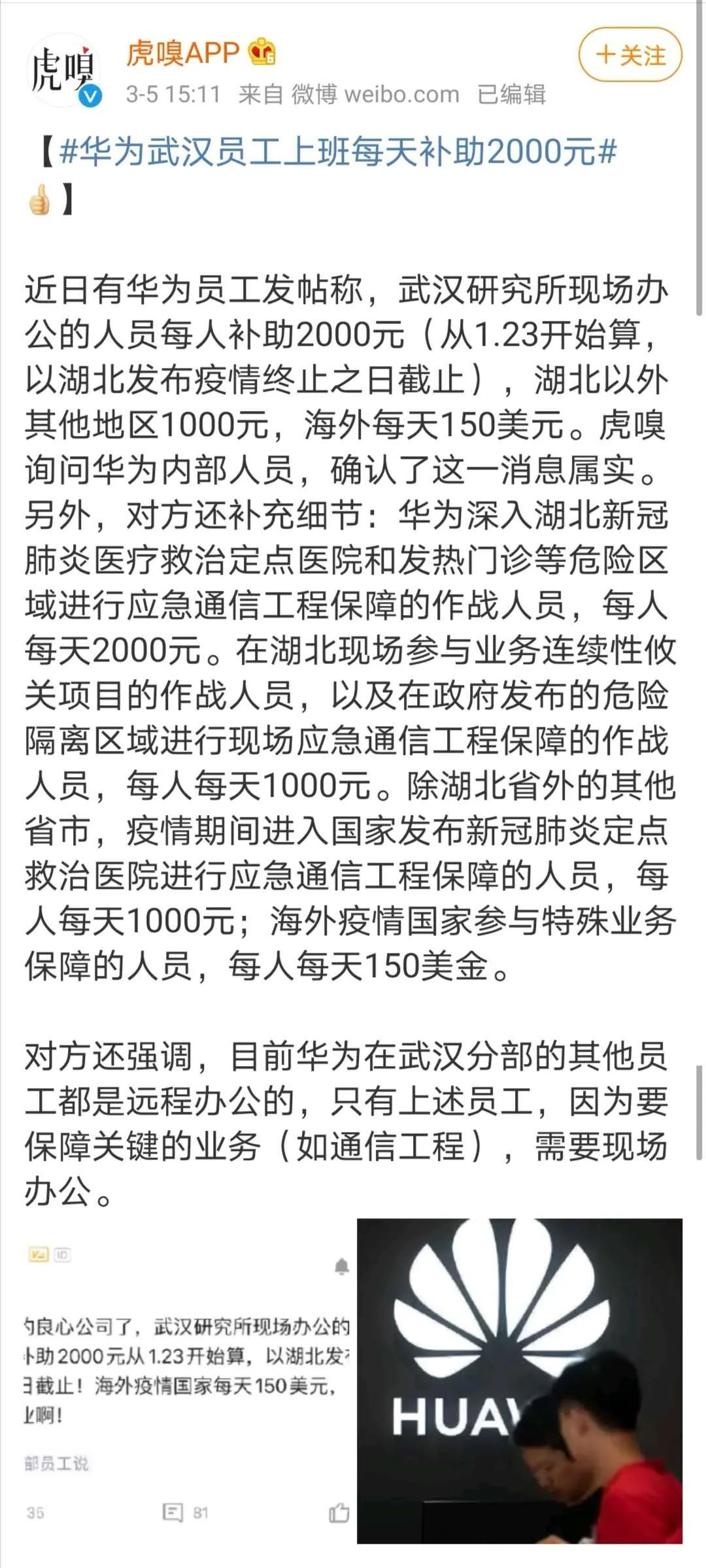 华为同样也对疫情期间参与保障工作的员工发放了补助:对武汉研究所现场办公的人员每人补助2000元(从1月23日开始算,以湖北发布疫情终止之日截止),湖北以外其他地区每人每天补助1000元,海外人员每人每天补助150美元。