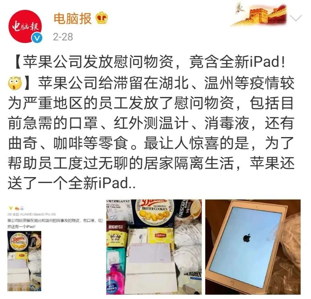 疫情期间,苹果公司给滞留湖北、温州等疫情较为严重地区的员工发放了大量慰问物质,包括当时急需的口罩、红外测温计、消毒液,还有曲奇、咖啡等零食,并为了帮助员工度过无聊的居家隔离生活,苹果还送了一个全新的iPad!