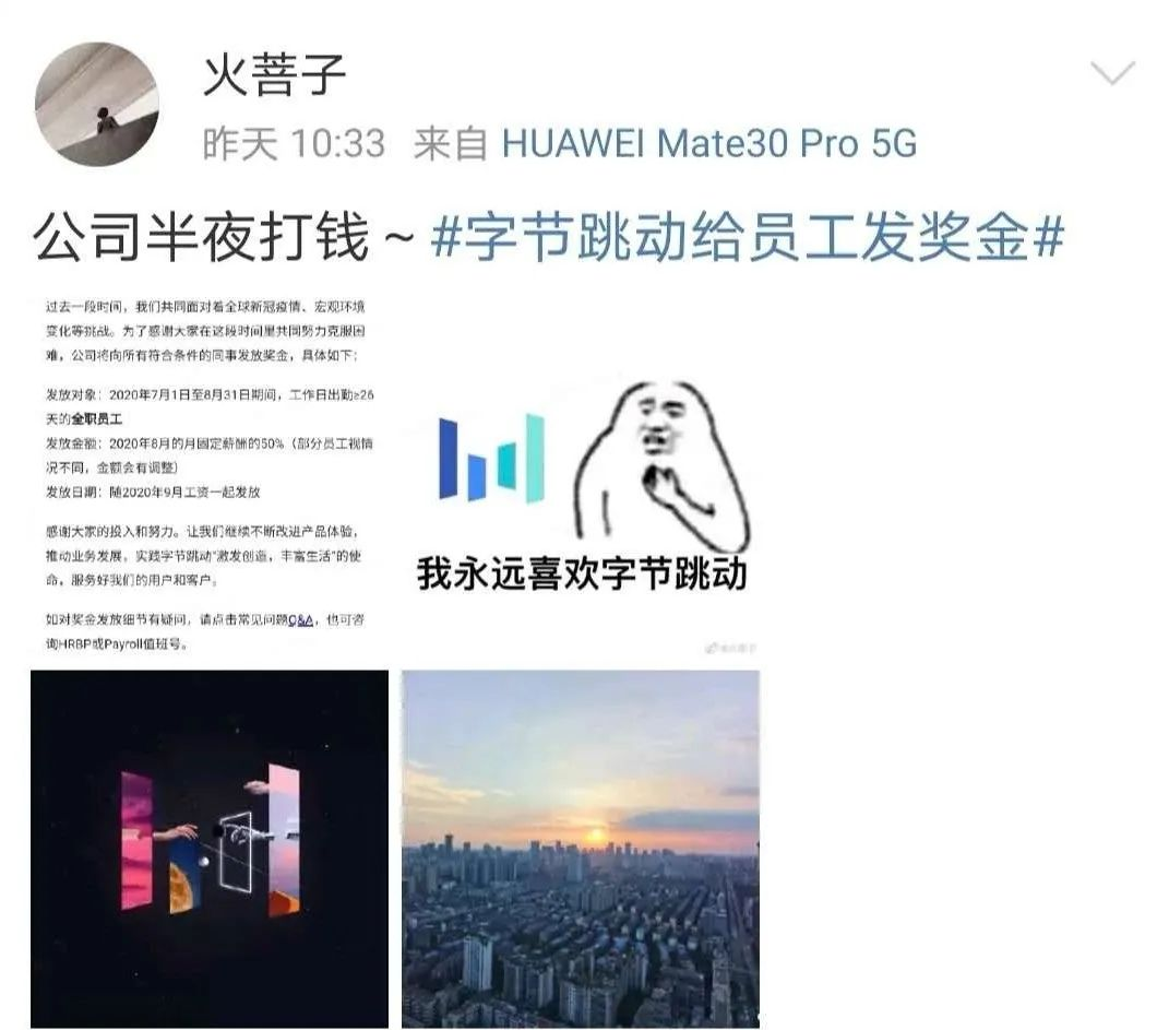2020年9月8日凌晨,字节跳动公司突然发送邮件宣布向员工发放奖金。