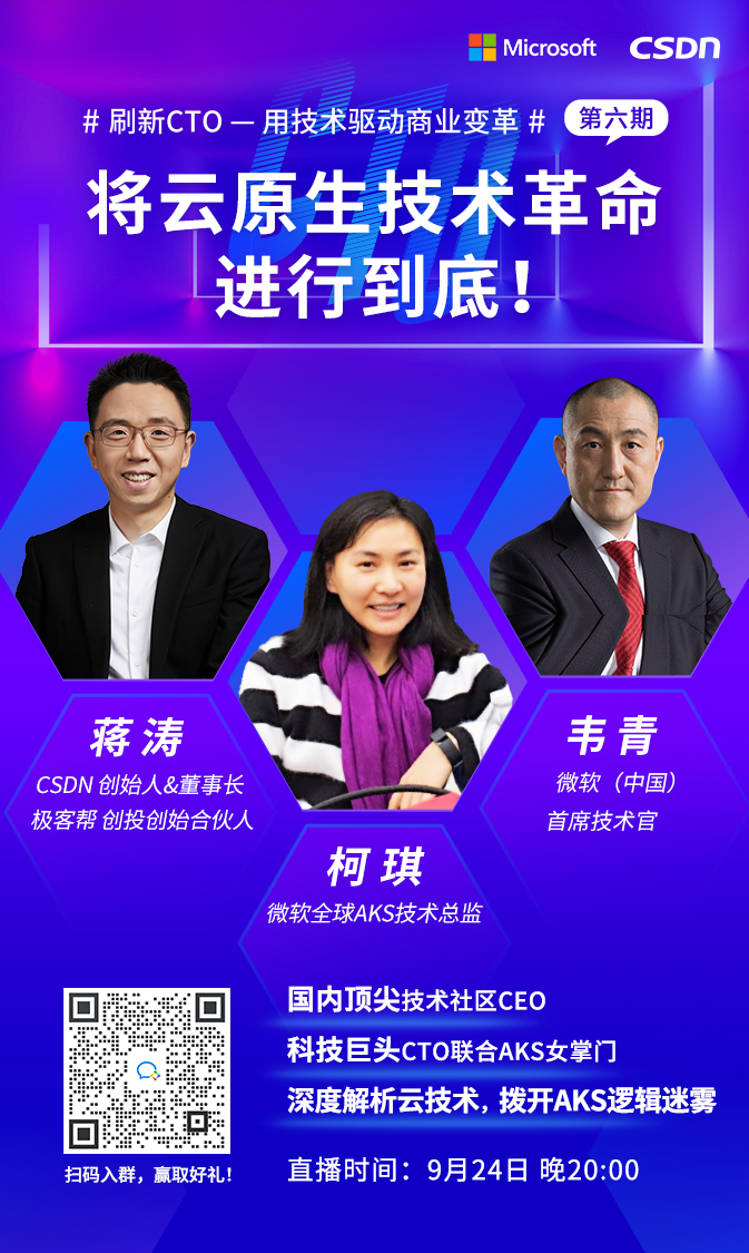 9 月 24 日 20:00,由微软、优快云 联合重磅打造,致力于用「用技术驱动商业变革」的《刷新 CTO》第六期,邀请到微软全球 AKS 技术总监柯琪,优快云 创始人&董事长、极客帮创投创始合伙人蒋涛,微软(中国) 首席技术官韦青,共同论道云原生技术发展历程与应用实践,解读国内外云原生技术现状进程与异同点,云原生将剑指何方?即将重磅分享!