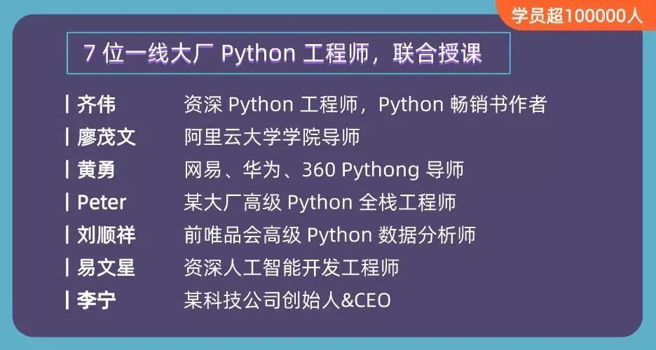 他们有来自阿里、网易、华为、360 等企业的 Python 讲师,并且均有着超 10 年以上的实战开发经验。