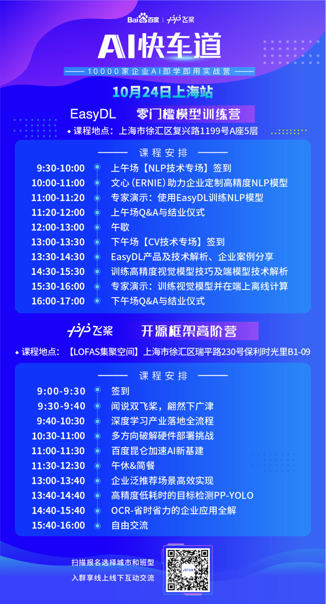 10 月 24 日当天,百度 AI 快车道【飞桨开源框架高阶营】线下课程 “闪现” 上海站,邀请 “魔都程序猿” 和 “沪上程序媛” 来到上海市徐汇区瑞平路 230 号保利时光里 B1-09——LOFAS集聚空间,与百度资深高工、各位行业开发者相聚一堂。上海站内容绝对不会令你 “空脑而归”,开发全流程、部署工具、高精度目标检测、模型优化方案一一奉上,更有“全能”OCR、金牌推荐算法,一起来场硬核趴体吧!