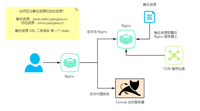 静态资源比如 HTML 文件极少变化,就可以专门放到一台服务器上,直接访问,不需要与后台服务器交互(比如 Tomcat)。