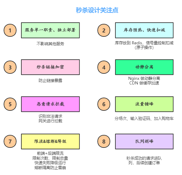 上面通过科幻小说的方式来讲解了秒杀系统中关注的点,下面是对秒杀系统关注的八大点的一个总结: