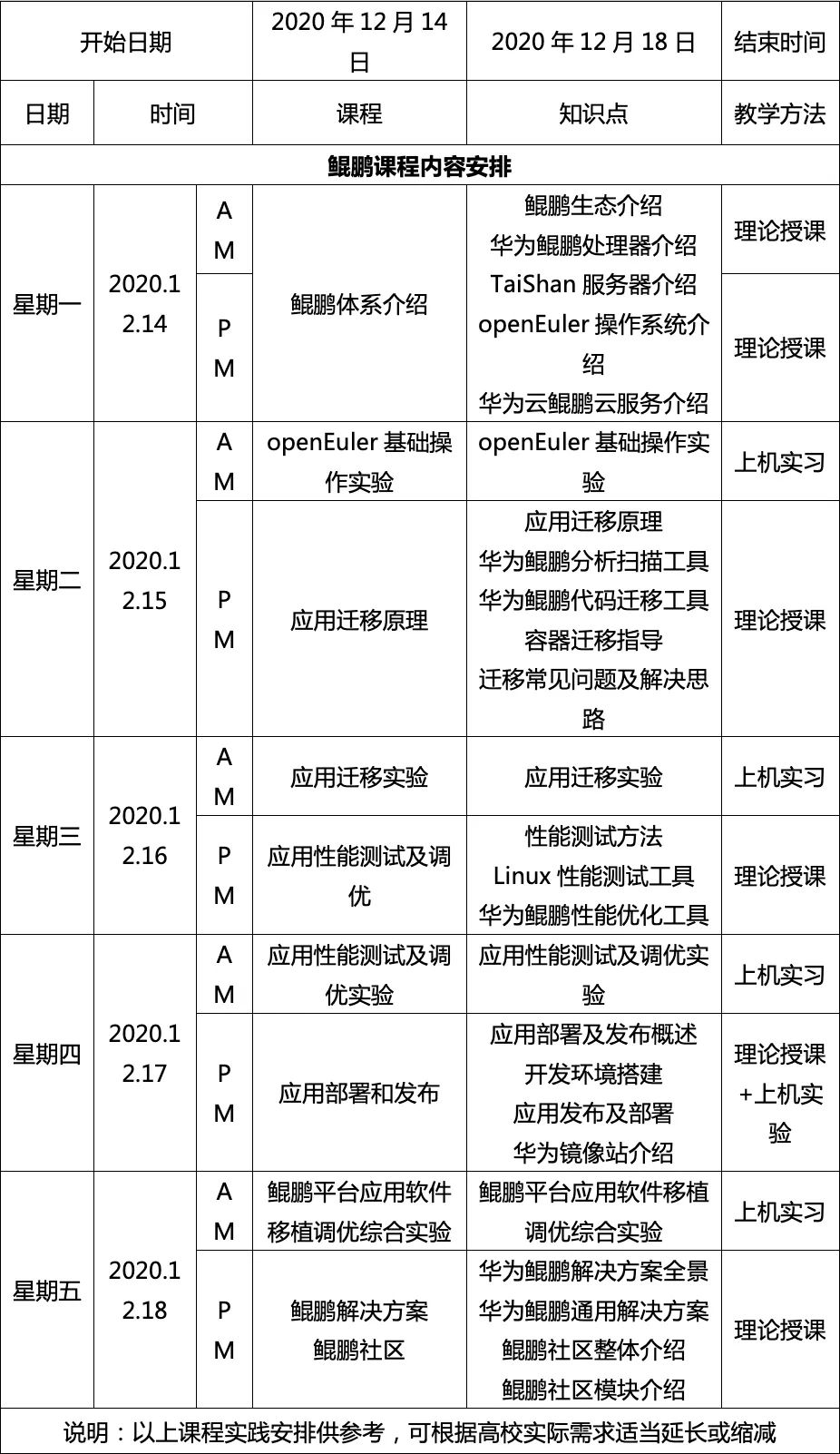 课程时间选择了12月14日-12月19日(6天)、12月21日-12月26日(6天)、12月27日-12月30日(4天),每天8小时,按照6天+6天+4天模式连续交付。具体课程内容如下表所示: