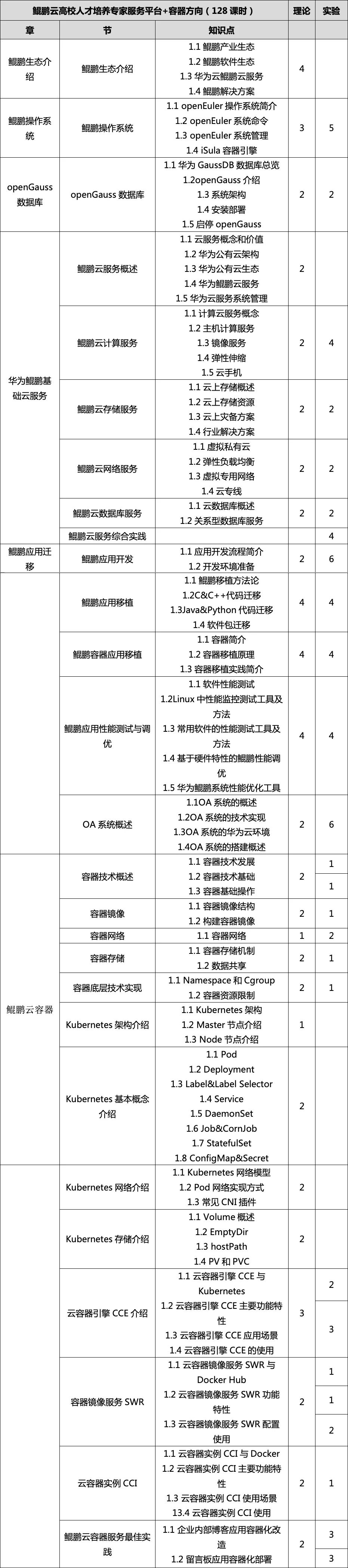 课程将会帮助学员更好的了解计算产业发展趋势,以及鲲鹏计算产业的概述;了解华为openGauss数据库,和openEuler操作系统;了解华为云鲲鹏云服务的全景,鲲鹏云服务的常见服务类型,技术规格,和主流应用场景;了解鲲鹏应用迁移:鲲鹏应用开发、鲲鹏应用移植、鲲鹏容器应用移植、鲲鹏应用性能测试与调优、OA系统概述;了解鲲鹏云容器、鲲鹏云容器概述、容器镜像、容器网络、容器存储及容器底层技术实现,掌握Kubernetes架构介绍、基本概念介绍、网络介绍及存储介绍,掌握云容器实例,熟悉鲲鹏云容器服务最佳实践案例。