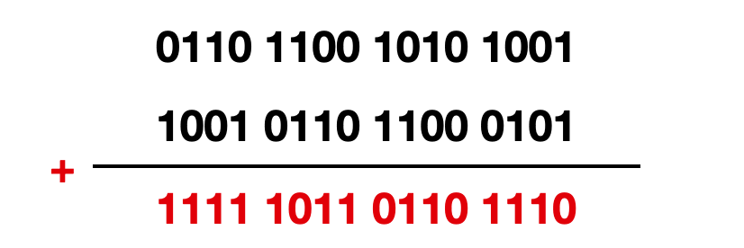 最后一次相加的位会进行溢出,溢出位1要被舍弃,然后进行反码运算,反码运算就是将所有的1变为0,0变为1。因此1000 0100 1001 0101的反码就是0111 1011 0110 1010,这就是校验和,如果在接收方,数据没有出现差错,那么全部的4个16比特的数值进行运算,同时也包括校验和,如果最后结果的值不是1111 1111 1111 1111的话,那么就表示传输过程中的数据出现了差错。