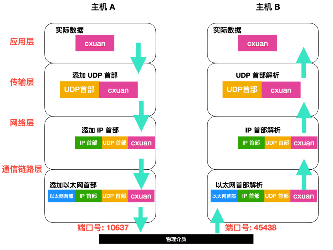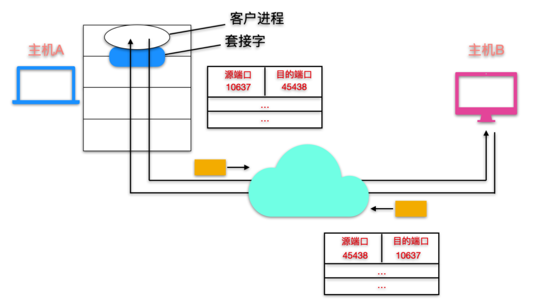 开发人员会编写代码确定端口号是周知端口号还是时序分配的端口号。假如主机 A中的一个10637端口要向主机B中的45438端口发送数据,运输层采用的是 UDP协议,数据在应用层产生后,会在运输层中加工处理,然后在网络层将数据封装得到IP数据报,IP数据包通过链路层尽力而为的交付给主机B,然后主机 B会检查报文段中的端口号判断是哪个套接字的。