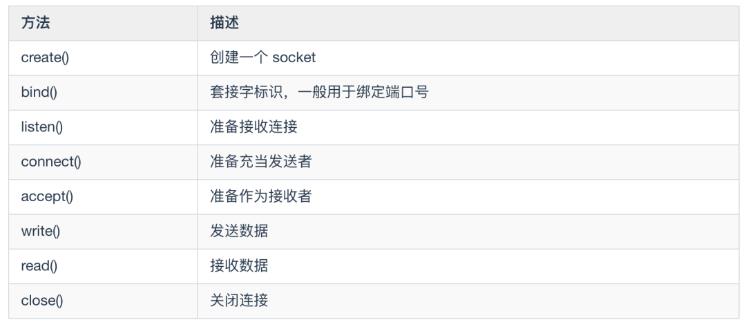 现在我们知道了, Socket 和TCP/IP没有必然联系,Socket的出现只是方便了 TCP/IP的使用,如何方便使用呢?你可以直接使用下面Socket API的这些方法。