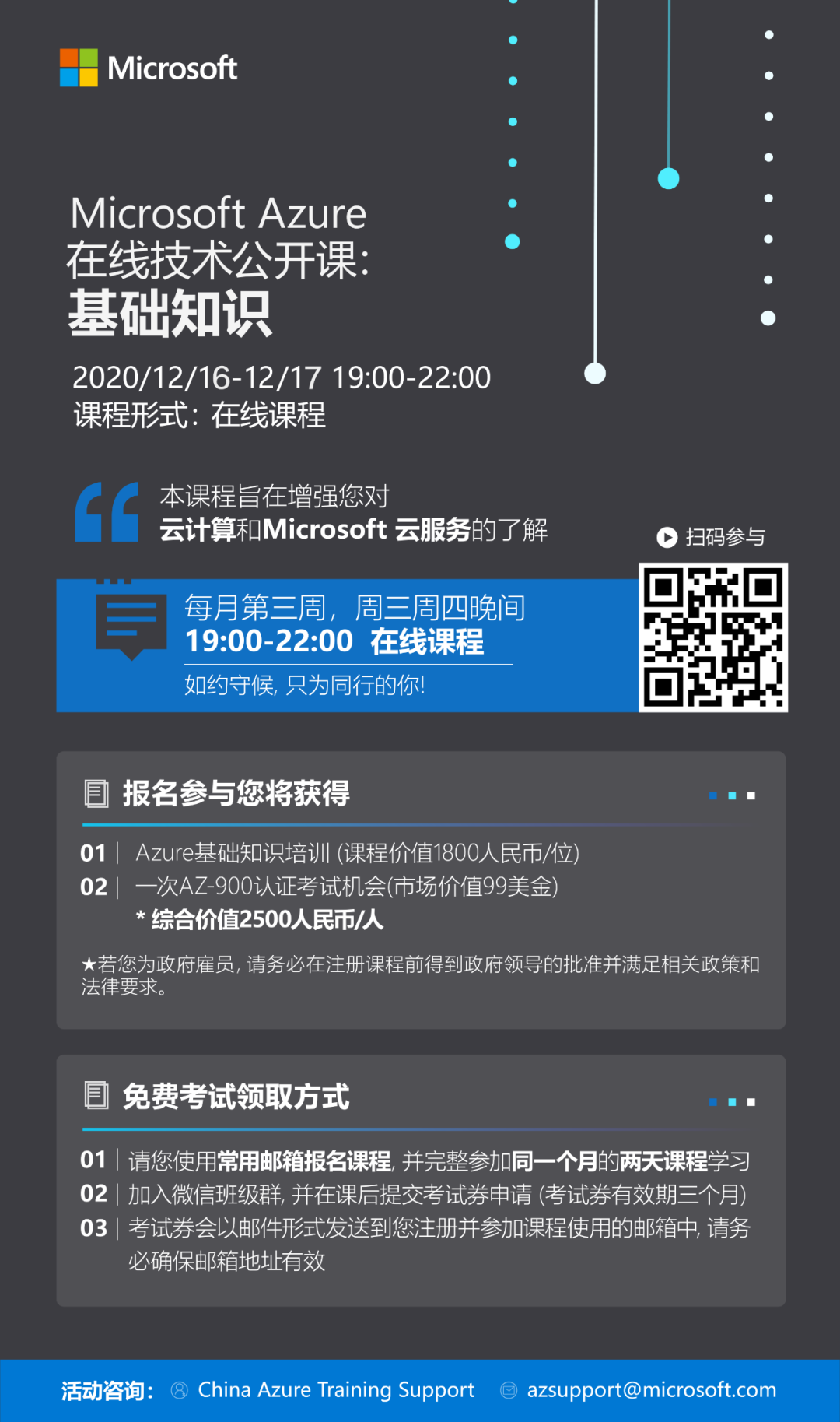 12 月 16-17 日,我们邀请到业界知名的技术专家,详解云计算概念,Azure 关键技术知识和配置、管理方式,Azure 资源监控等知识,精彩课程议题抢先看: