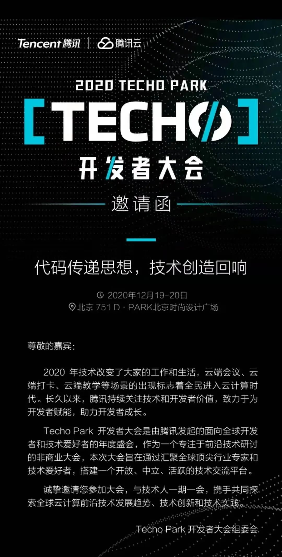 12月19日至20日,由腾讯主办的2020 Techo Park开发者大会将于北京召开。据了解,本次大会将邀请全球超过200位顶级技术专家来到现场,和数千位参会者就云计算、大数据和人工智能等前沿技术话题展开深度交流。预计将有超过百万用户通过线上和线下方式分享这场技术的年度盛会。